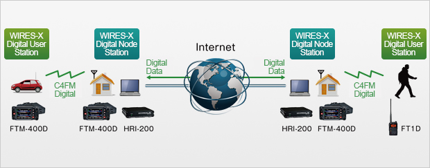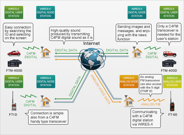 WIRES-X supports the C4FM digital and the clear and crisp voice technology enables high sound quality. By repeating C4FM digital data as it is via the Internet, users can enjoy clear voice communications even if they are thousands of miles away each other. Utilizing the digital communication, the WIRES-X operation is simple, easy and user friendly. Varieties of the new functions as well as voice communications expands opportunities for enjoyment of ham station operation.