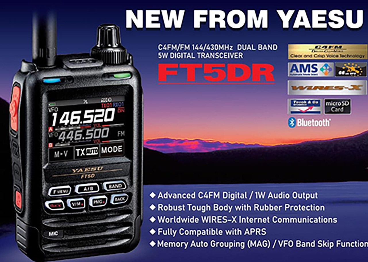 Plus advanced features of the new FT5DR are: Wireless hands-free operation using the optional Bluetooth® headset (SSM-BT10); VOX function; Memory Auto Grouping (MAG); VFO Band Skip Function; Wide-range RX coverage with continuous reception from 0.5MHz–999.99MHz (A Band) & 108MHz–580MHz (B Band); Built-in high-sensitivity 66 channel GPS receiver; 1200/9600bps APRS Data modem; 2,200mAh High-Capacity Li-ion Battery Pack (SBR-14LI) as standard; Voice Recording Function; Simultaneous AM/FM broadcast Reception while monitoring two frequency channels; Micro SD Card Slot.